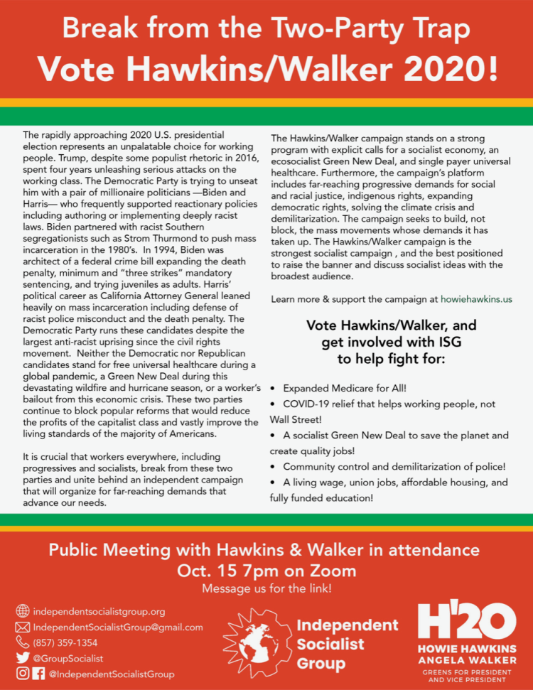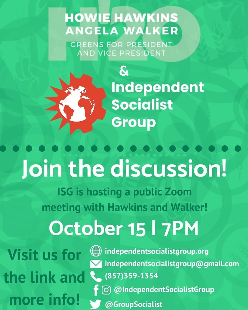 Live Discussion Tonight with ISG and the Hawkins/Walker 2020 Campaign! Posted byIndependent Socialist GroupOctober 15, 2020Posted inElections Share this: Click to share on X (Opens in new window) X Click to share on Facebook (Opens in new window) Facebook Click to email a link to a friend (Opens in new window) Email Related