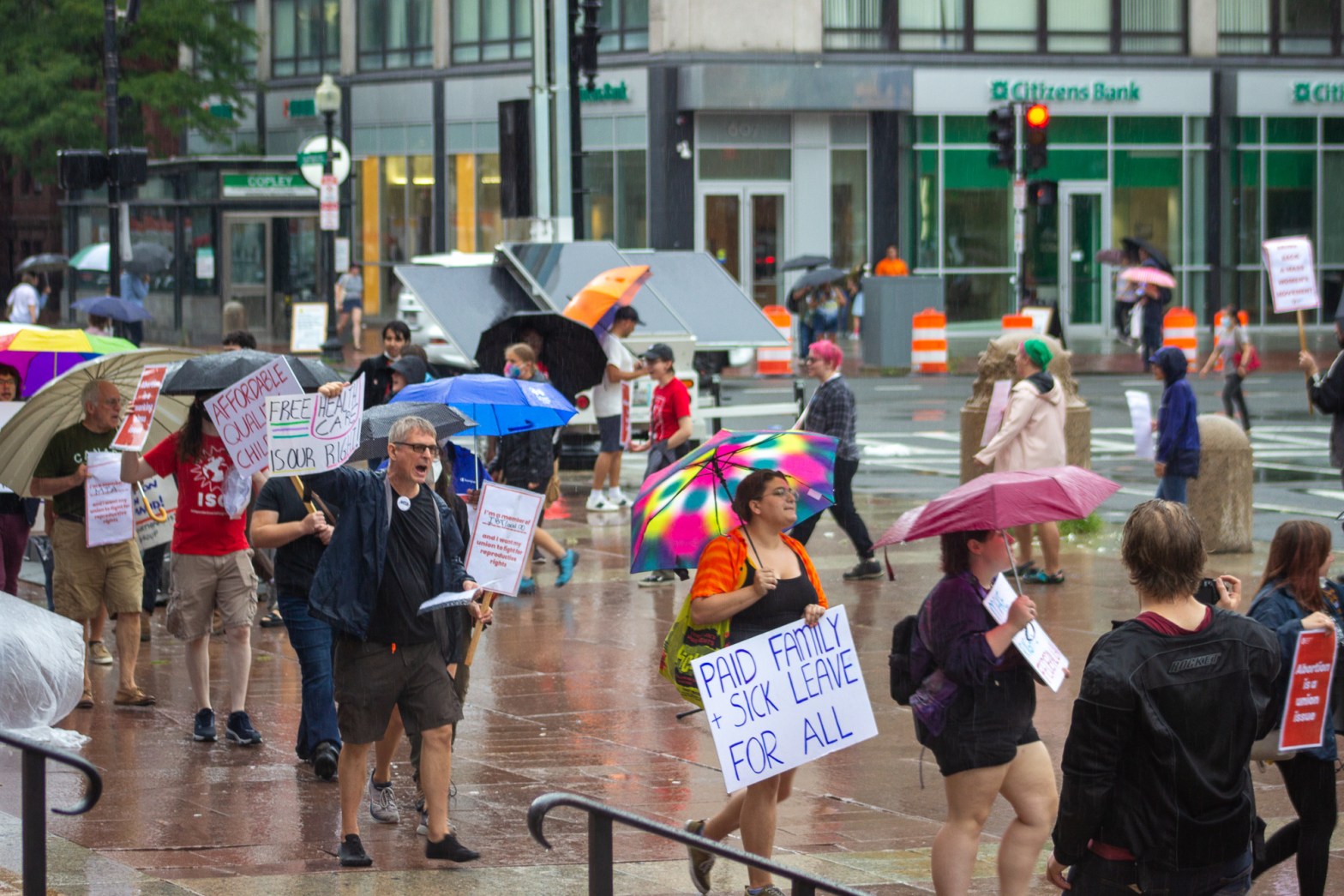 Members of the Independent Socialist Group (ISG) wanted our unions to take visible and public action to defend reproductive rights. So we organized with members of our various unions and other unions in the greater Boston area for a standout on Labor Day in Copley Square in Boston, Massachusetts. Coming together as Union Power for Reproductive Justice, we represented voices from the MTA, IATSE, SBWU, AFSCME, SMART-TD, Teamsters, and other unions. In heavy rain, dozens of other workers, students, community members, and organizations also came out in support, picketing for almost two hours.
