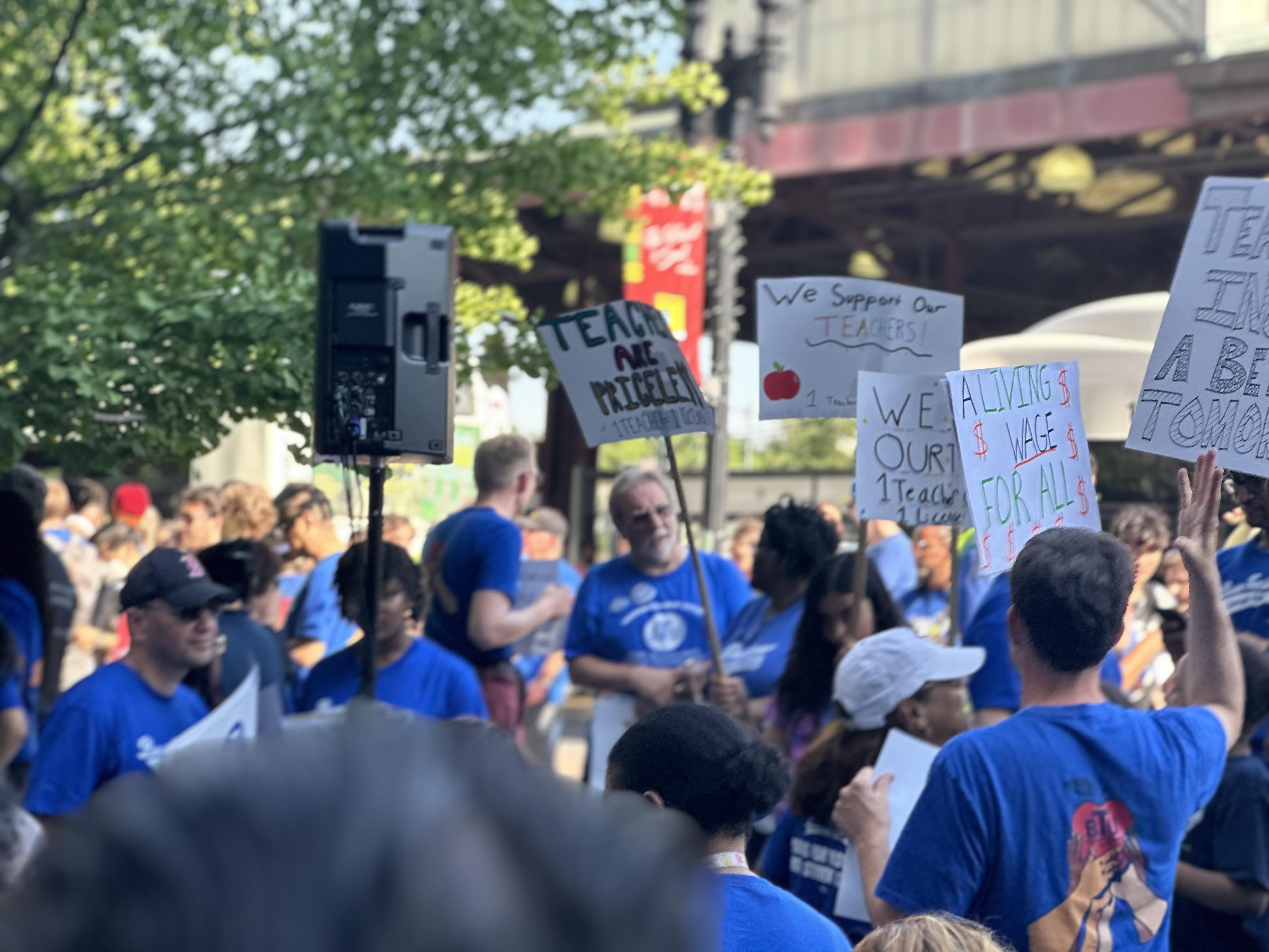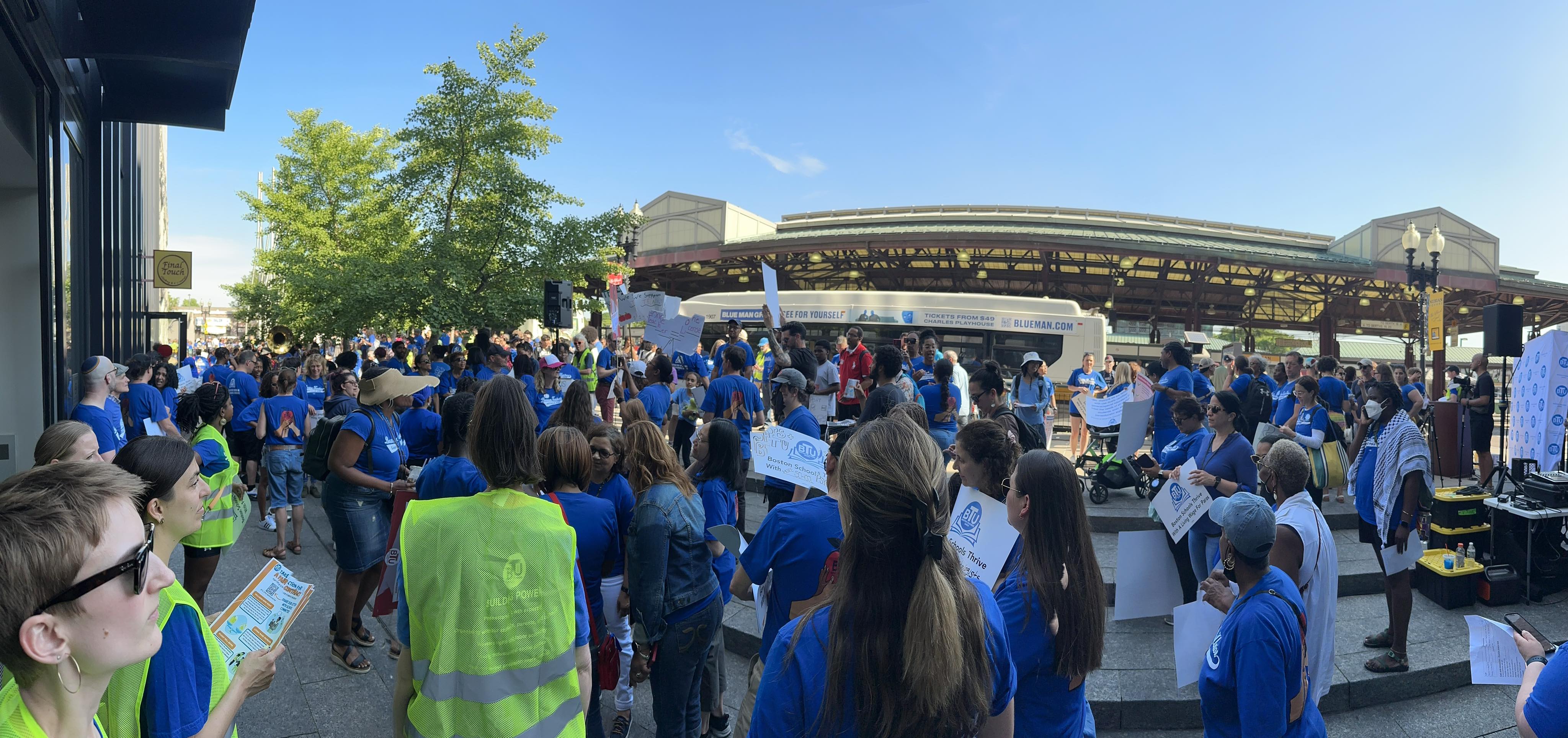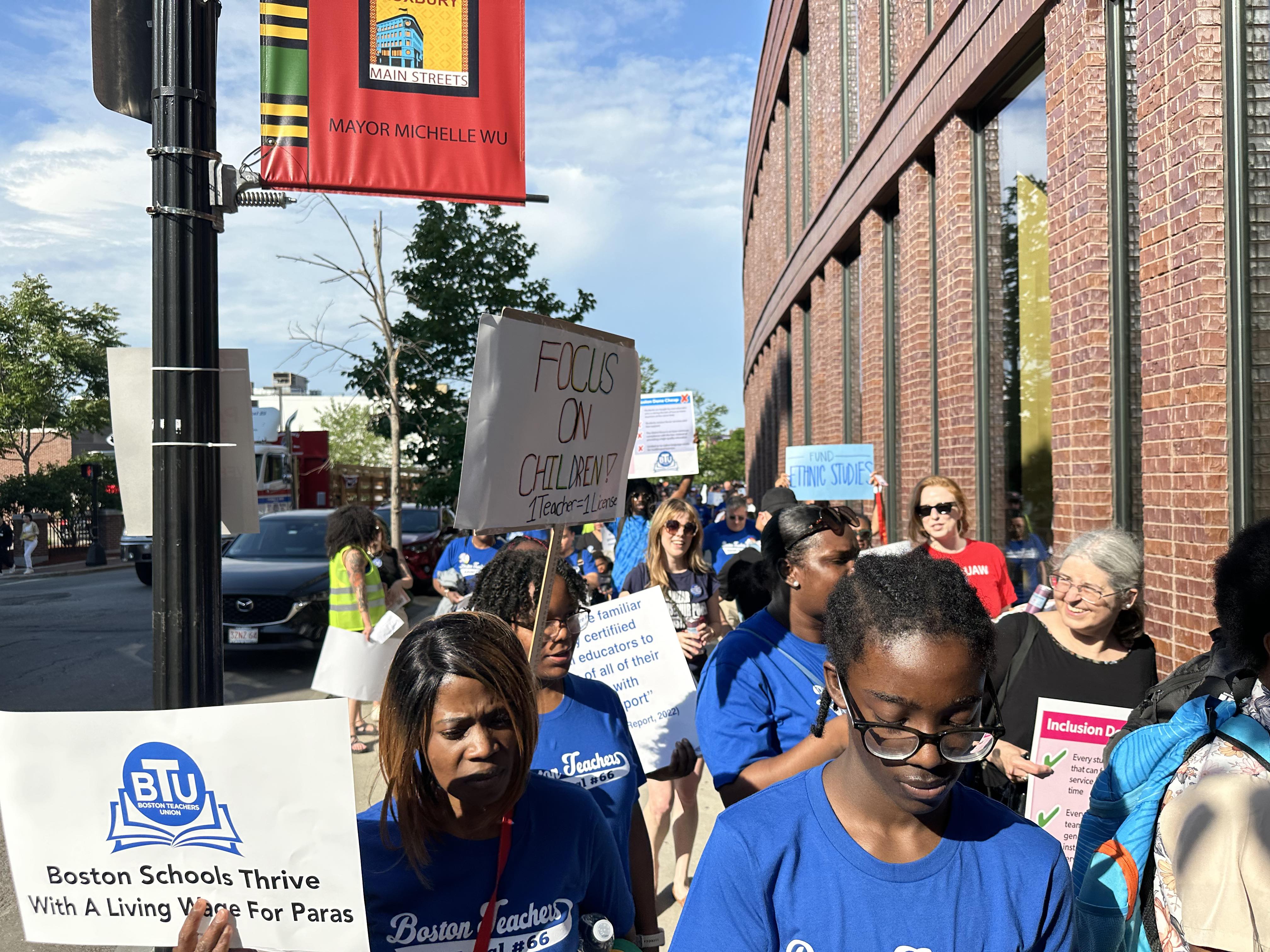 Members of the Boston Teachers Union (BTU) rally on June 5 outside the Bolling Building before the union’s negotiation session.