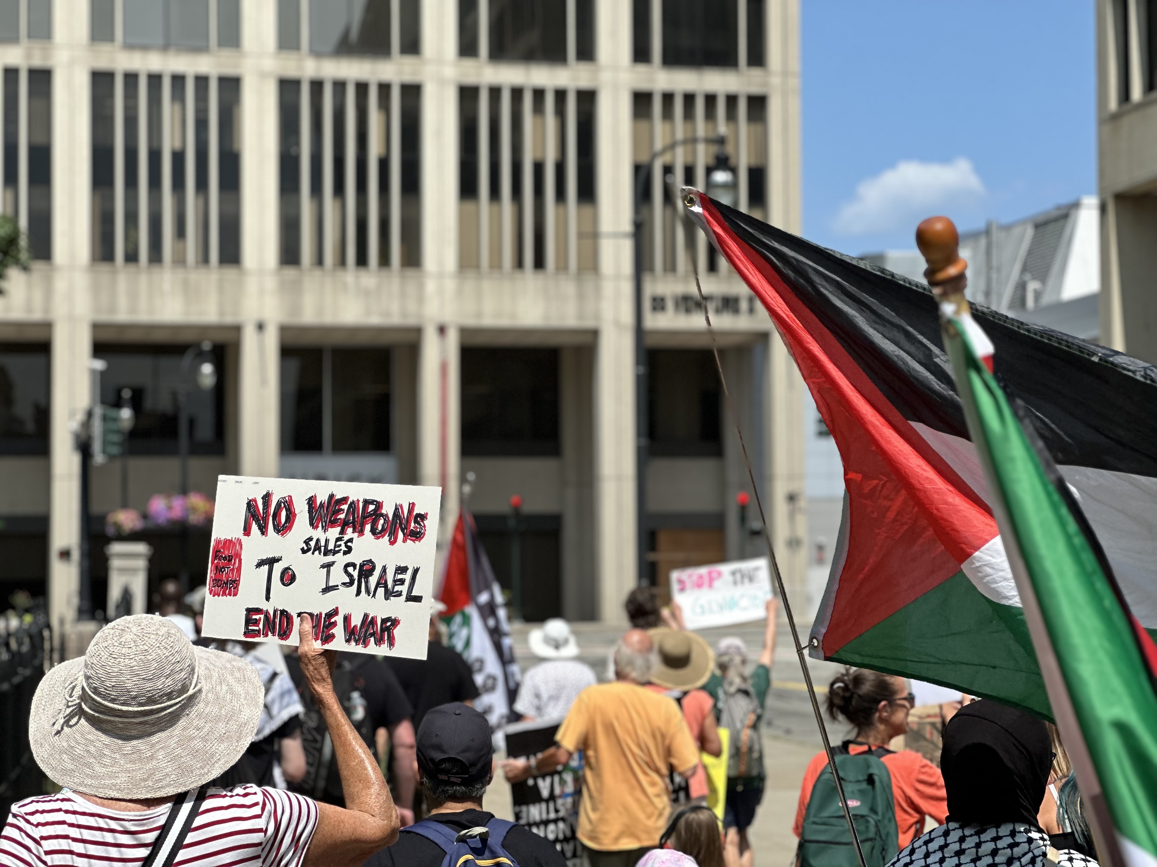 - An end to all US military aid and weapons sales to the Israeli military. For strikes and walkouts by union workers to stop weapons shipments.